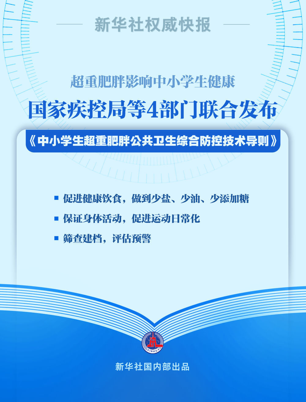7月22日,国家疾控局、教育部、国家卫生健康委和国家体育总局联合发布《中小学生超重肥胖公共卫生综合防控技术导则》。